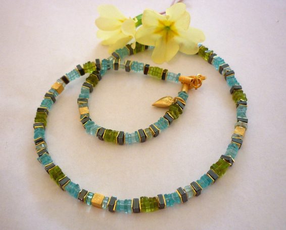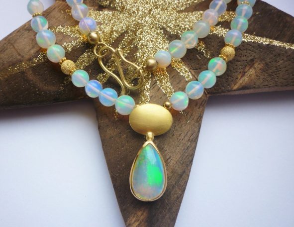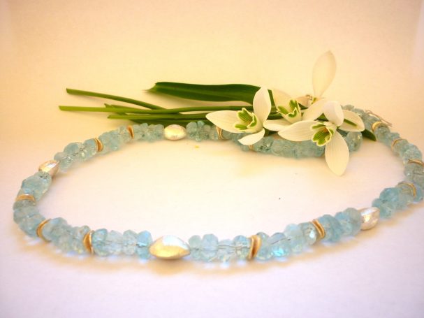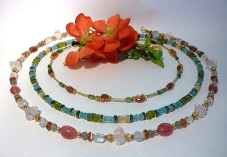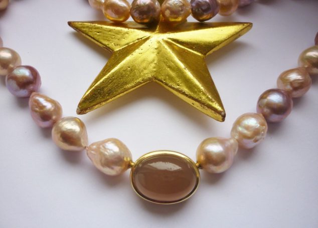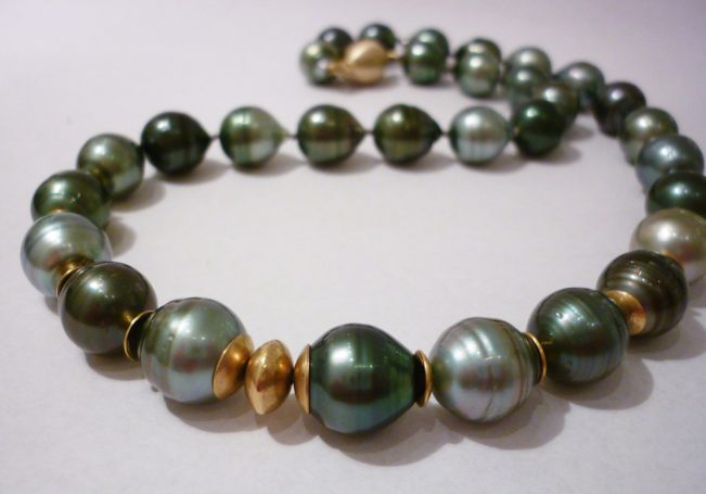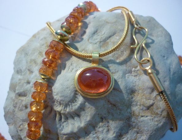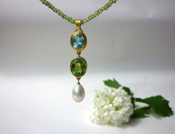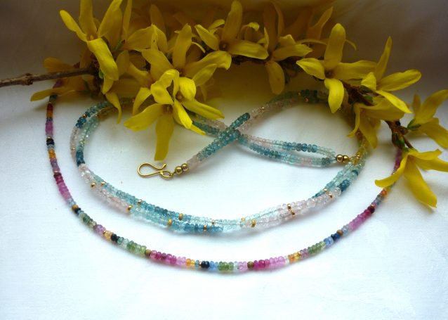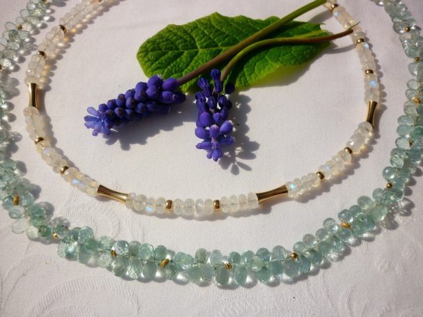 In meinem Sortiment finden Sie fantasievolle Edelsteinketten mit Goldelementen sowie Ketten aus Süßwasser- oder Tahiti-Perlen. Ebenso fertige ich Anhänger aus edel geschliffenen Steinen, gefasst in Gold und Silber, oder mit handgetriebenen Motiven.